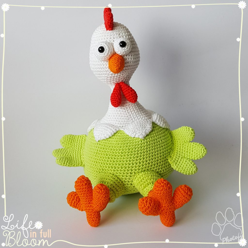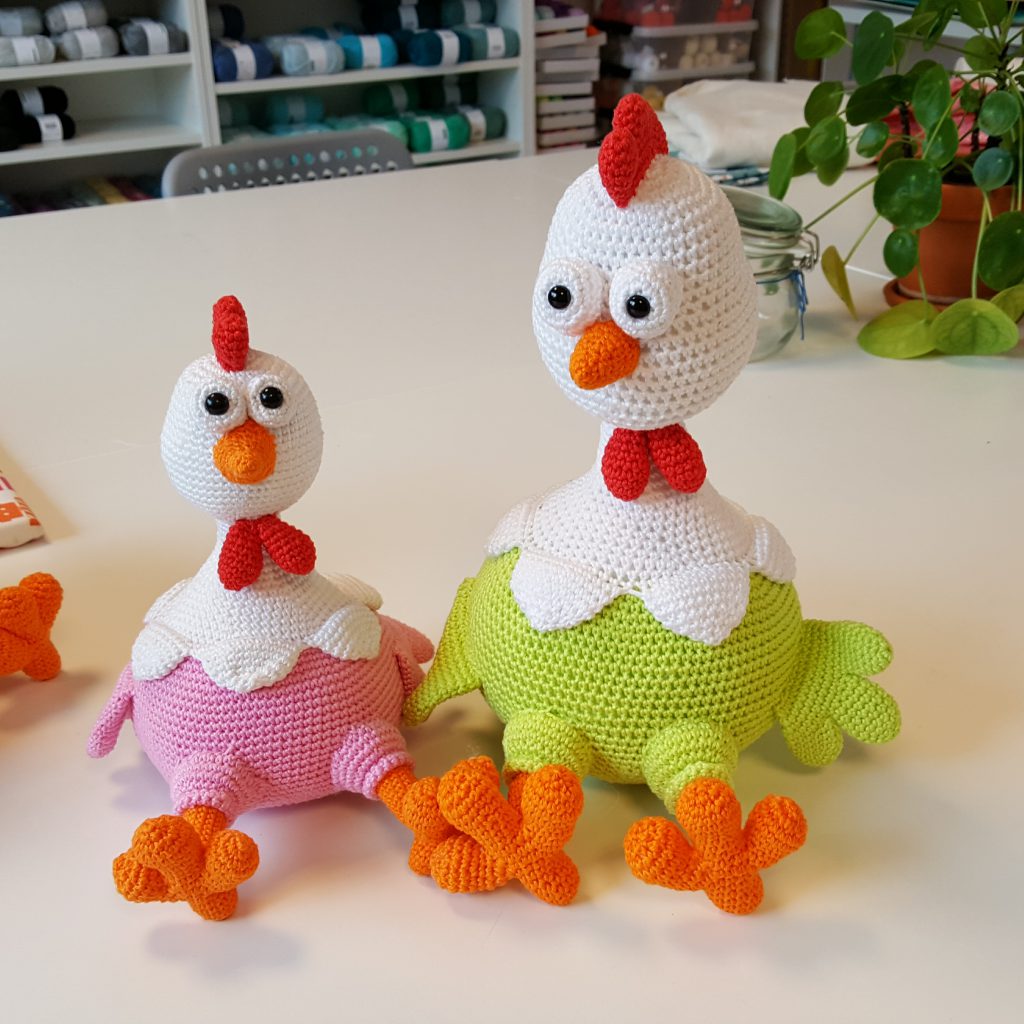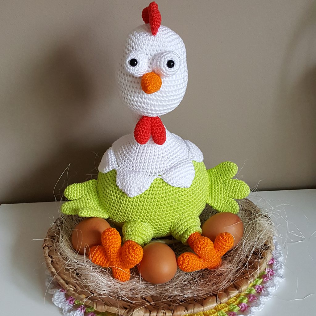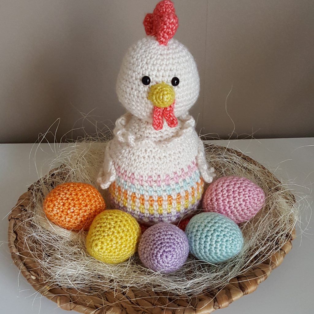 Op instagram kwam ik het leuke patroon van een kip met kuikens van jookzcreaties tegen. Ik was op slag verliefd en ging snel garen kopen voor deze leuke kip met kuikens. Dat was wel alweer vorig voorjaar dat ik dat garen had gekocht.  Gelijk ging ik aan de slag met de kip. Je kent dat vast wel, je handen jeuken en het garen brandt in je tas om er gelijk mee te beginnen. Zodat er gelijk weer een WIP in de haakmand erbij ligt ;-).  En wat is het een leuk patroon en ook goed te volgen. Na de kip haakte ik eerst de eieren. Want ja een kip broedt natuurlijk eerst de eieren uit. Ik was ook begonnen aan de kuikens, maar helaas deze had ik niet op tijd af gekregen. Pasen viel vorig jaar iets eerder dan dit jaar ;-).