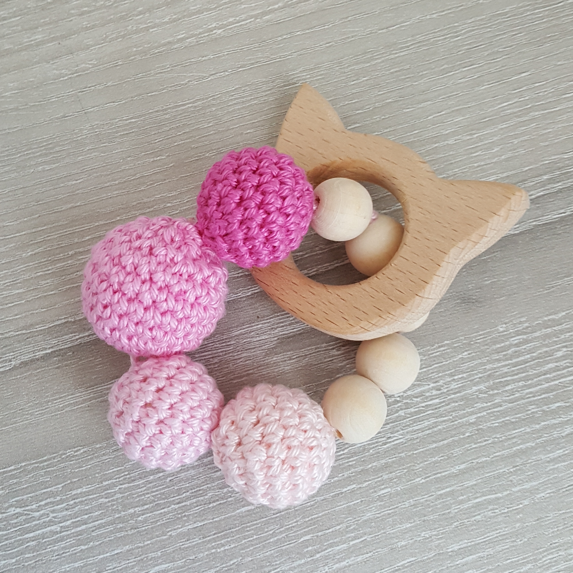 Voor de allerkleinste een leuke houten bijtring met houten- en gehaakte kralen. In het midden zit een rammelaar. Zou u liever een andere kleurcombinatie willen of een andere combinatie met het houten figuurtje kunt u altijd een mail sturen of het via het contact formulier vragen.