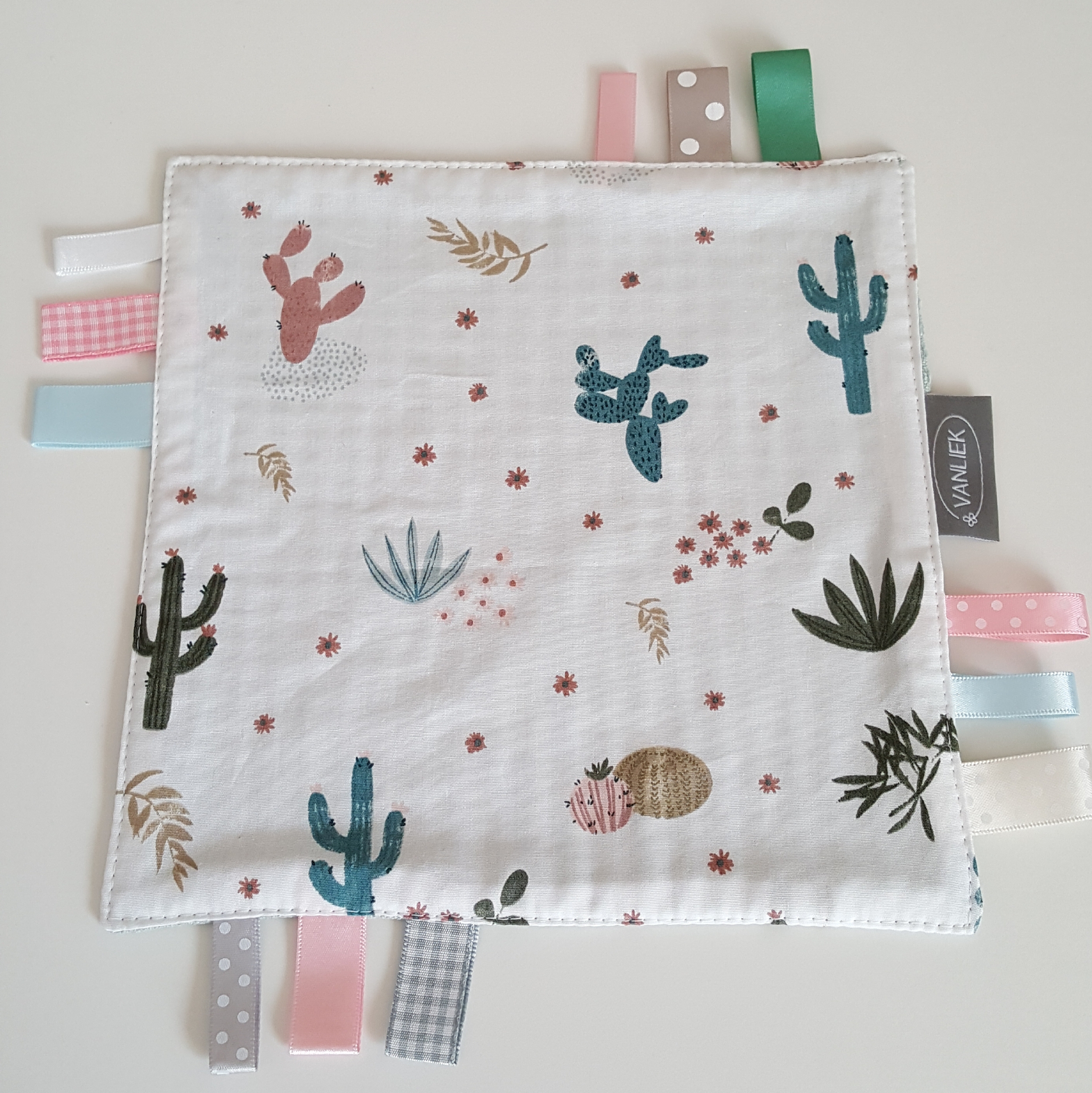 • Voor de allerkleinste een labeldoekje gemaakt van 100% katoenen stoffen. Een kant is zacht wafelkatoen en de andere kant is een katoenen stof met een print.