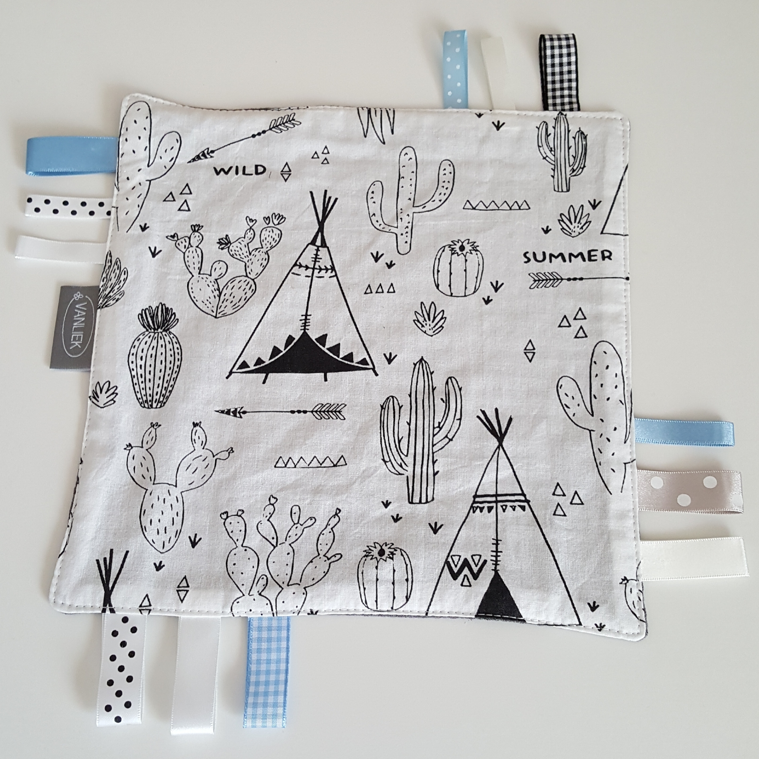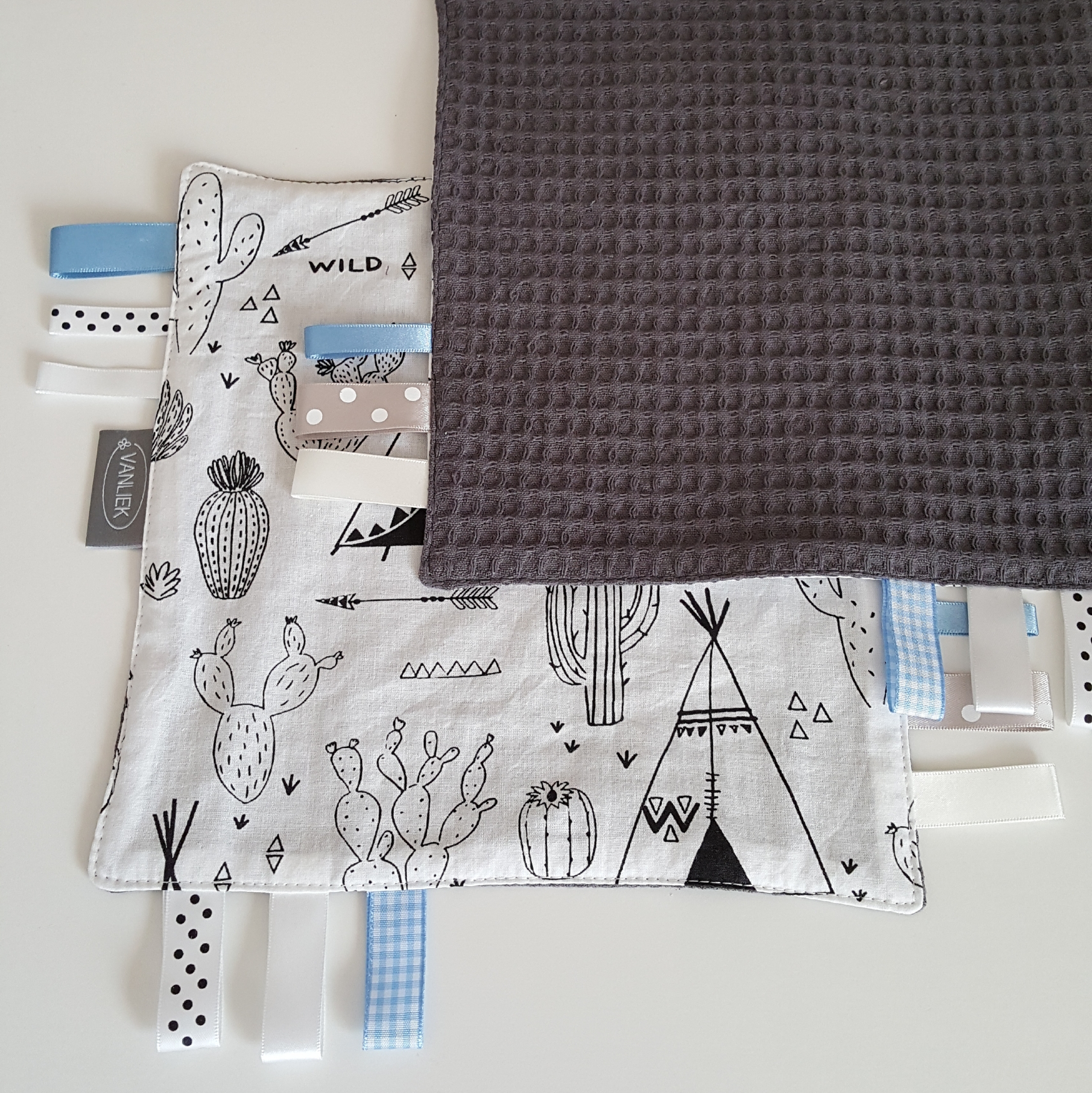 • Voor de allerkleinste een labeldoekje gemaakt van 100% katoenen stoffen. Een kant is zacht wafelkatoen en de andere kant is een katoenen stof met een print.