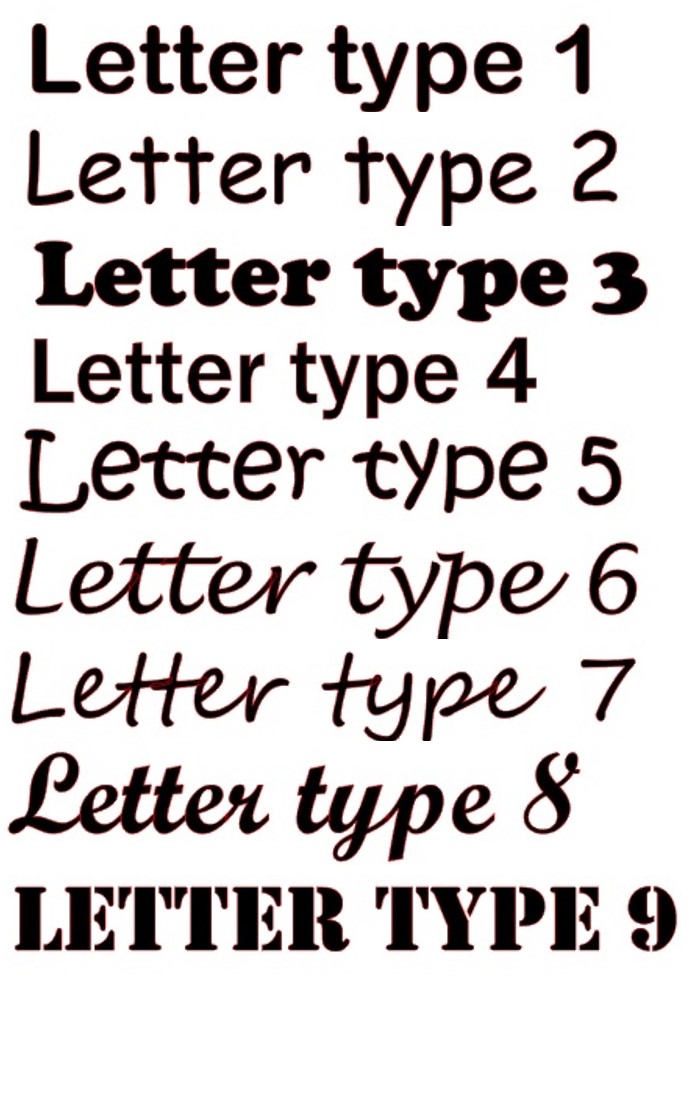 Lettertype 1, Lettertype 2, Lettertype 3, Lettertype 4, Lettertype 5, Lettertype 6, Lettertype 7, Lettertype 8, Lettertype 9, Lettertype 10