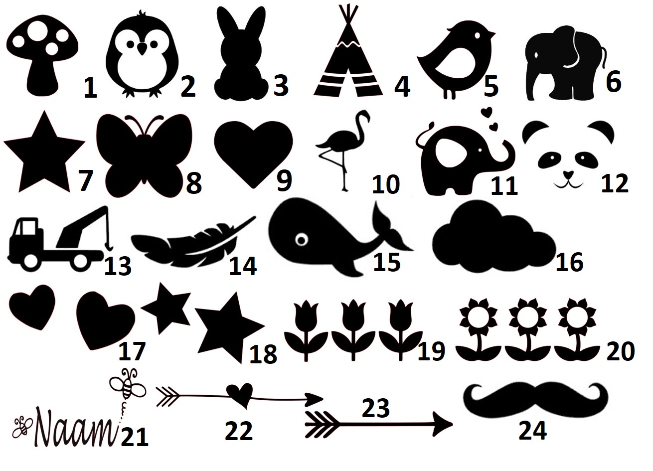 1. Paddenstoel, 2. Uil, 3. Konijn, 4. Tipi tent, 5. Vogeltje, 6. Olifant, 7. Ster enkel, 8. Vlinder, 9. Hart enkel, 10. Flamingo, 11. Olifant met hartjes, 12. Panda gezicht, 13. Takelwagen, 14. Veer, 15. Walvis, 16. Wolk, 17. 2 hartjes, 18. 2 sterren, 19. 3 tulpjes, 20. 3 zonnebloemen, 21. Bijtjes met naam ertussen, 22. Pijl met hartje erin, 23. Pijl, 24. Snor
