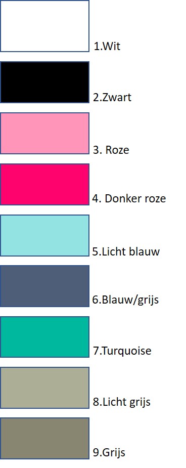 1. Wit, 2. Zwart, 3. Roze, 4. Donker roze, 5. Licht blauw, 6. Blauw/grijs, 7. Turquoise, 8. Licht grijs, 9. Grijs