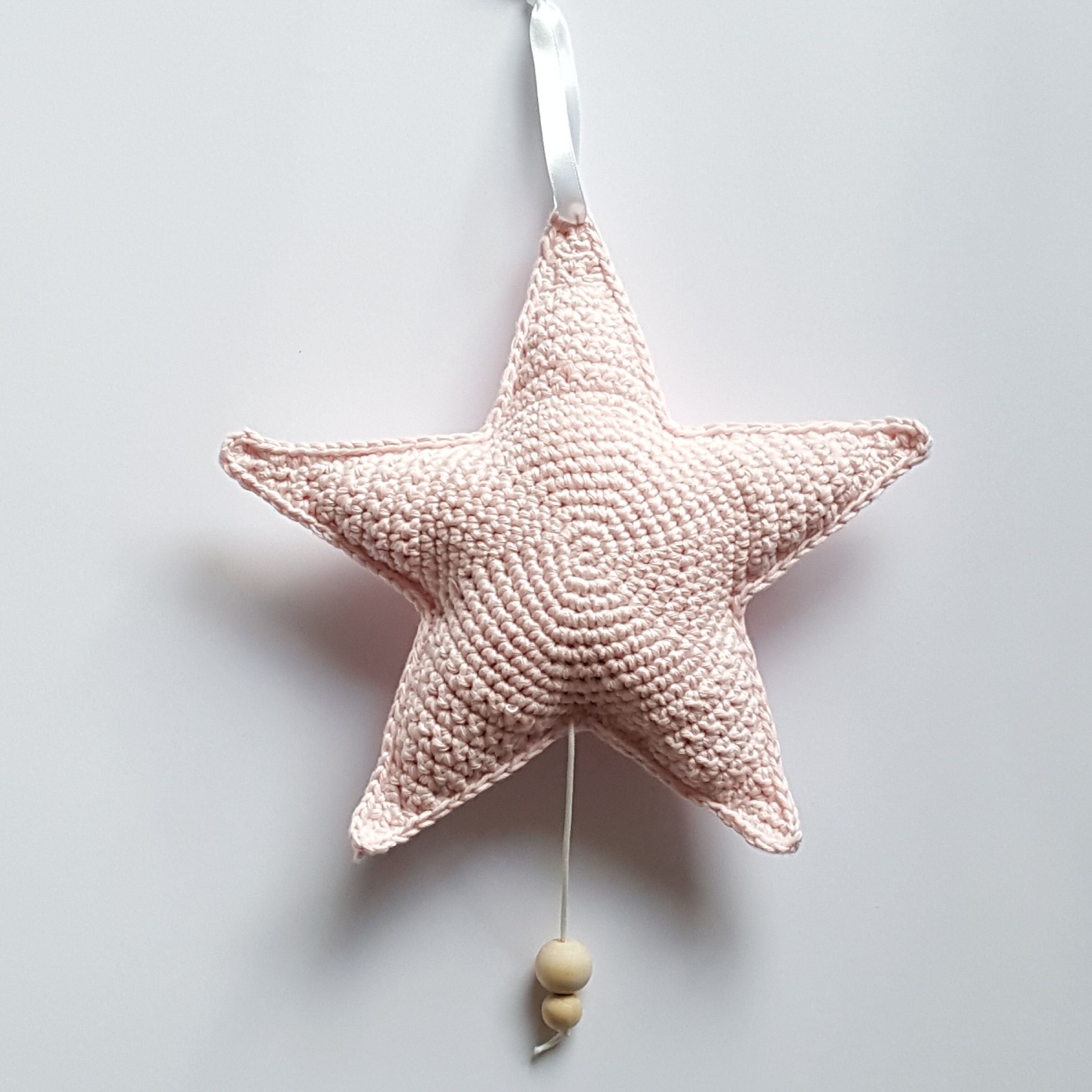 Een muziek ster met een heerlijk rustgevend slaapmelodietje voor de kleinste onder ons. Met een satijnen ophanglus kan deze muziek ster overal opgehangen worden. Gezellig bovenin het wiegje, boven de commode of boven het ledikantje. De ster is gehaakt met 100% katoen garen.